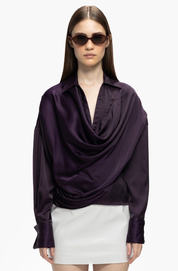 Cut from liquid satin. this shirt is designed to slip between structure and softness. A plunging V-neckline is veiled by a draped panel that collapses into a soft cowl. Side ruching near the hem shapes the silhouette just off-centre. while sharp French cuffs with quadruple buttonholes lend a sense of discipline to the otherwise undone collar and drop shoulders. A discreet button at the base of the V-neck allows for optional closure. Style it over tailored trousers or contoured skirts. Amplify the mood with the Long Satin Scarf.