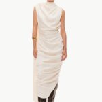 Cut in double satin with a soft. luxurious hand. this dress drapes fluidly through a sculpted cowl neckline and features a convertible scarf that can be styled in multiple ways. from a cascading back fall to a wrapped. asymmetric silhouette. Fine side-seam pleating adds gentle volume and movement. Pair with tall boots or minimal heels for a modern expression of evening femininity.