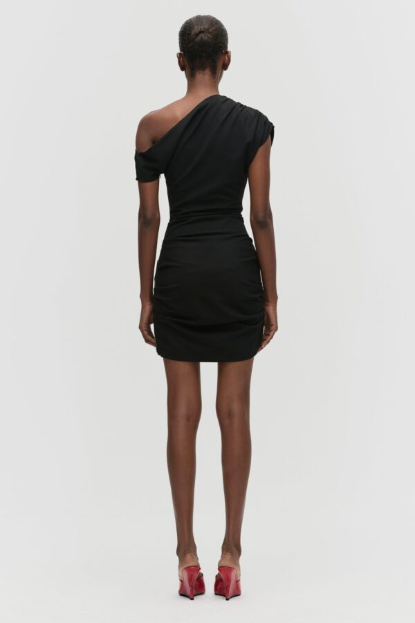 A one-shoulder mini dress defined by asymmetrical drape and directional pleating. The neckline wraps across the frame. gathering at one shoulder before falling into a sculpted line. Narrow pleats trace the side seams. contouring the waist and hip with controlled tension. Cut in a compact melange suiting. Finished with an exposed metal side zipper.