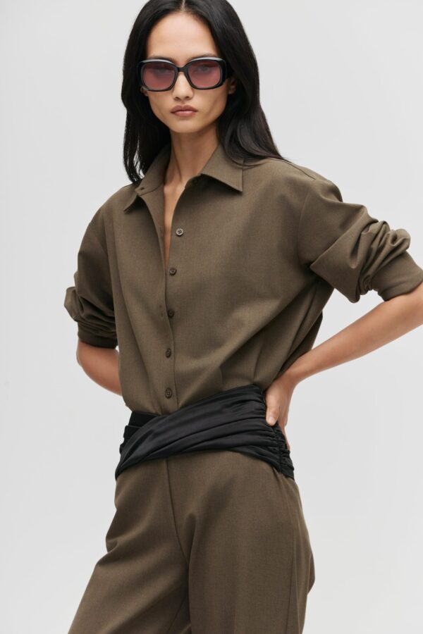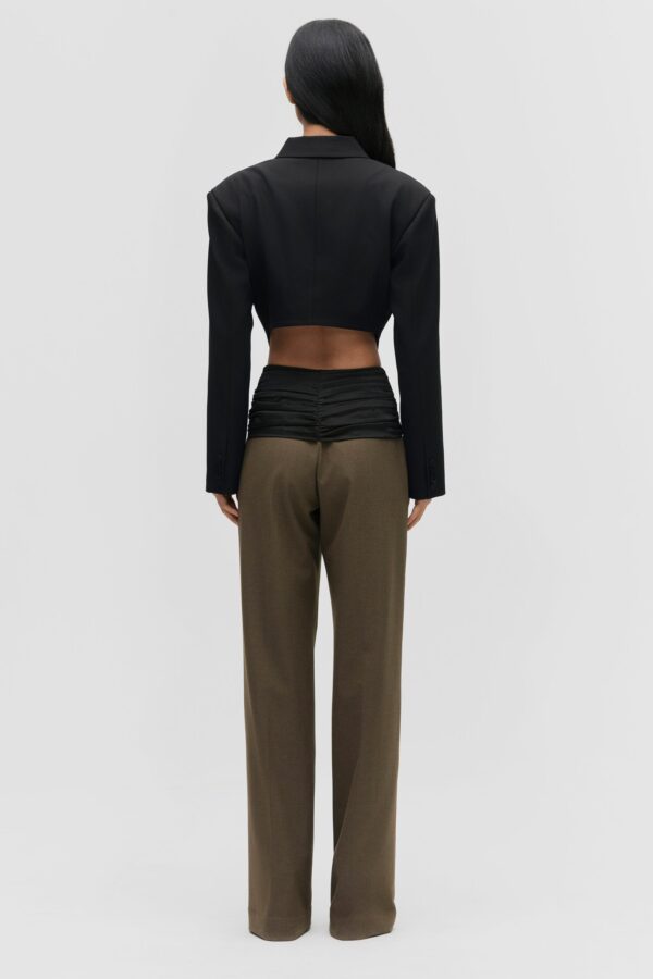 Tailored trousers interrupted by a satin gesture at the waist. A structured waistband and concealed front closure anchor the silhouette. while a permanently attached satin panel wraps across the front in a soft crossover. The overlay gathers subtly at the sides and center back. creating ruching that contrasts with the clean line of the trouser beneath. Fitted through the waist and upper hip. the leg falls long and straight. uninterrupted.